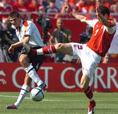 Alexander Frei i kamp med Steven Gerrard under kampen mot England. (Foto: AFP/Scanpix) |