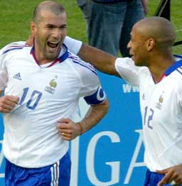 Zidane scoret på frispark og straffe mot England, og mange mener at hans frispark mot Kroatia som endret retning på Igor Tudor bør krediteres Zidane så lenge engelske Wayne Rooney ble kreditert for et skudd som traff både stolpen og keeper før ballen gikk inn.