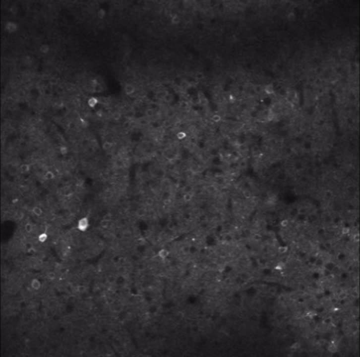 Videoen du ser i toppen av saken er fra en musehjerne. De lysende punktene er nerveceller i et område av hjernen som lyser opp når musa nærmer seg objekter den vet hvor er.