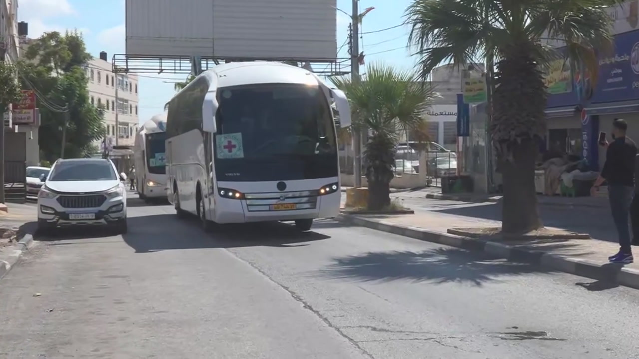 Busser med palestinske fanger ankommer Ramallah på den okkuperte Vestbredden.