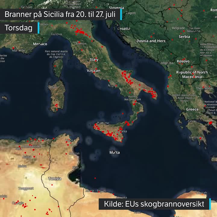 Kilde: EFFIS - CopernicusTre personar er stadfesta døde på Sicilia. Blant dei ei eldre kvinne og ein mann som blei funne i ein nedbrent bustad utanfor Palermo.
