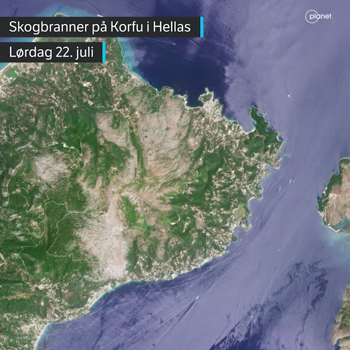 Satellittbilde viser korleis skogbrannen på Rodos åt opp stadig meir terreng førre veke.