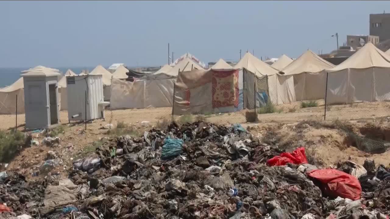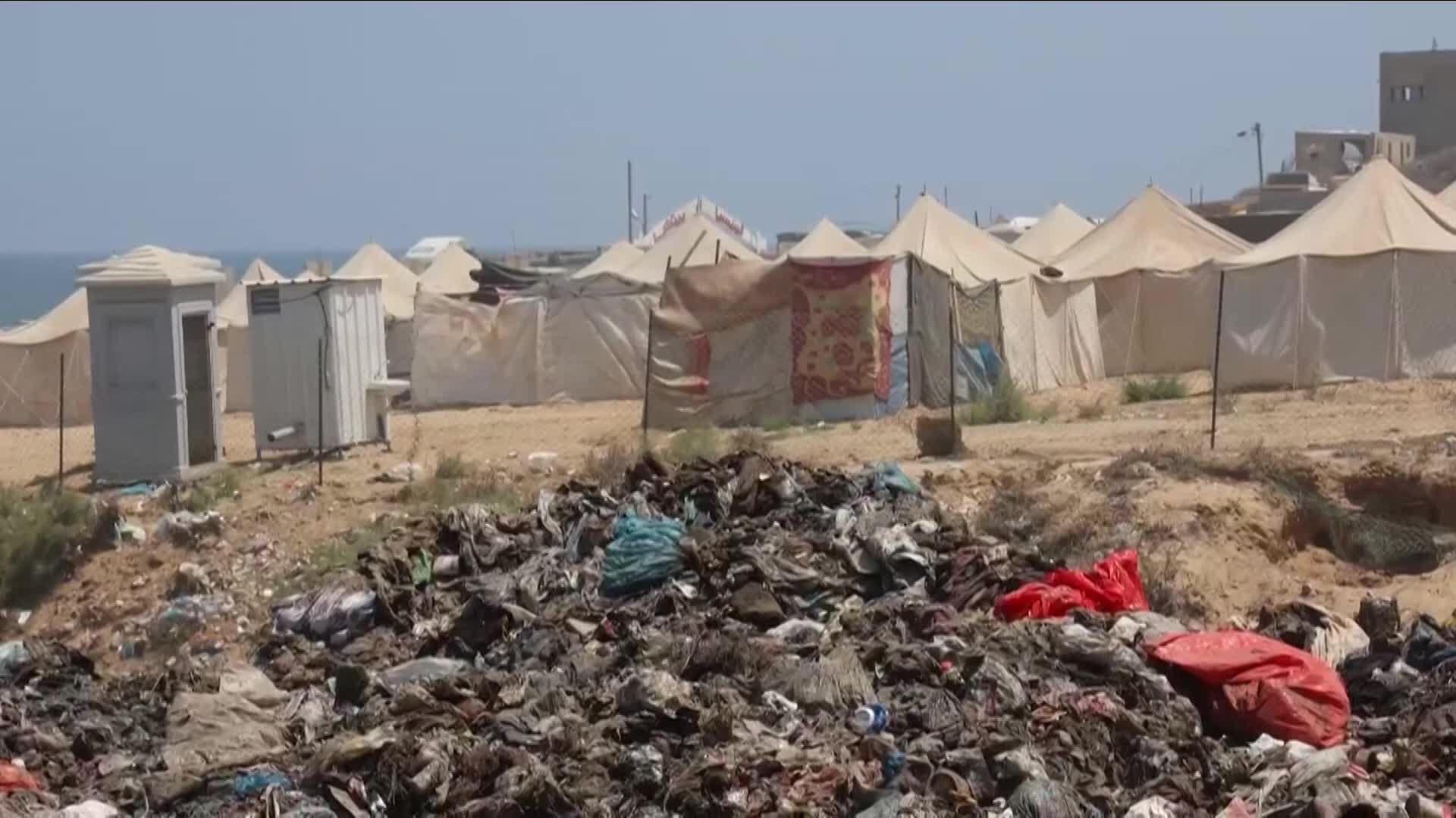Stanken frå søppelet trenger seg gjennom dei provisoriske telta i området. I mangel på fungerande avfallsanlegg, blir søppel samla inn og dumpa på opne område rundt om på Gazastripa.