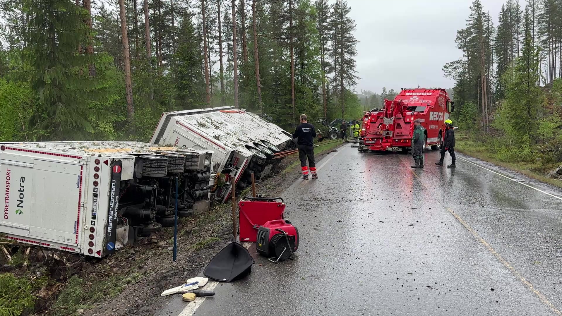 Vitner til ulykken varslet også politiet. De har ikke fått snakket med vitnene utover at vogntoget har kjørt av veien.