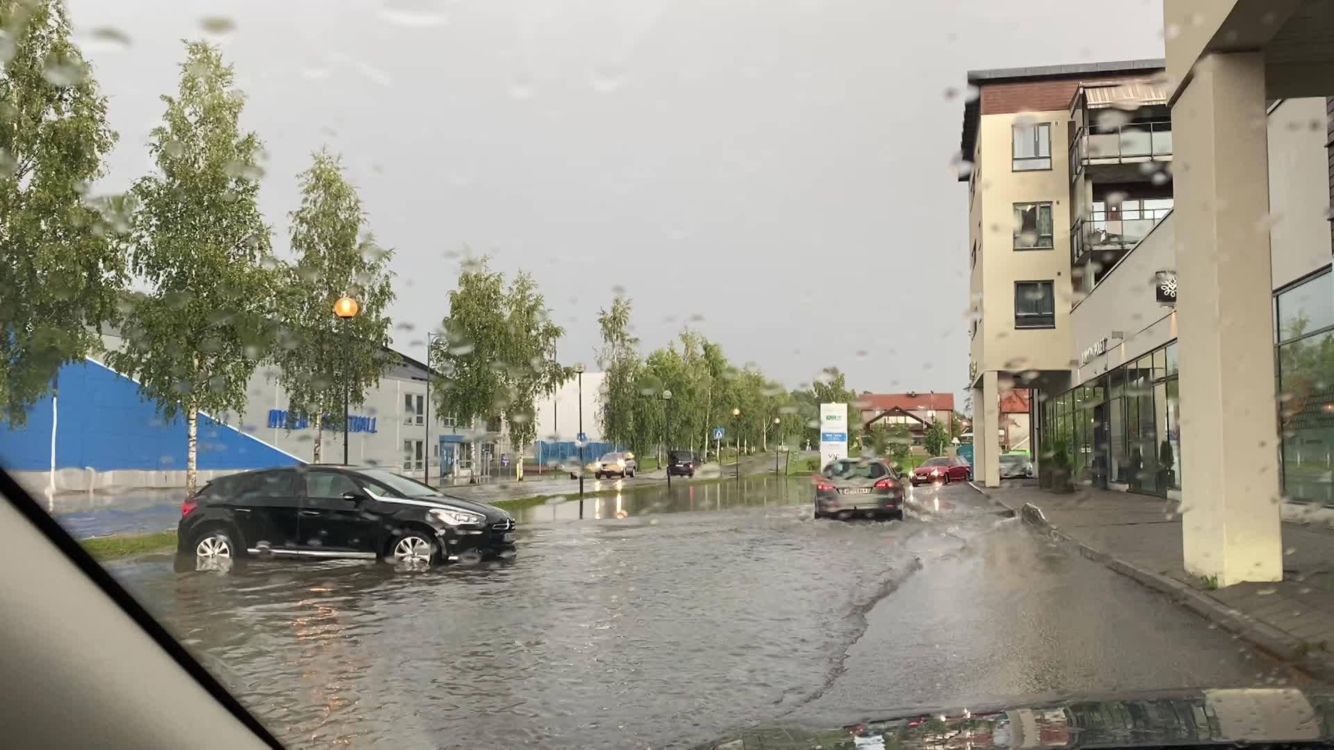 I Mysen er det flere oversvømmelser. Her fra en parkeringsplass under vann i sentrum av byen.